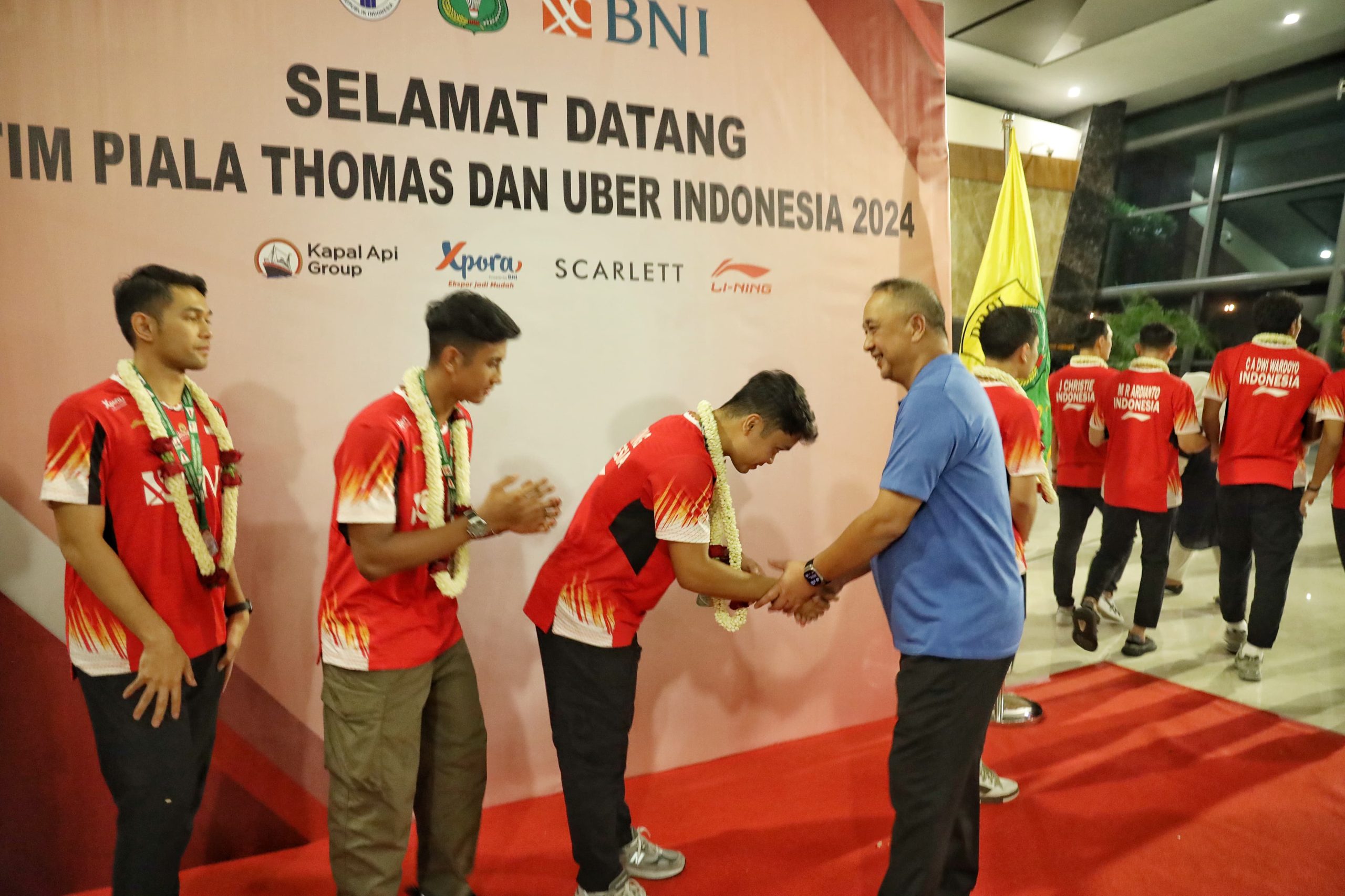 Kepulangan para atlet bulu tangkis ke Tanah Air tersebut disambut langsung Direktur Utama BNI Royke Tumilaar di Bandara Internasional Soekarno-Hatta, Tangerang, Senin (6/5).
