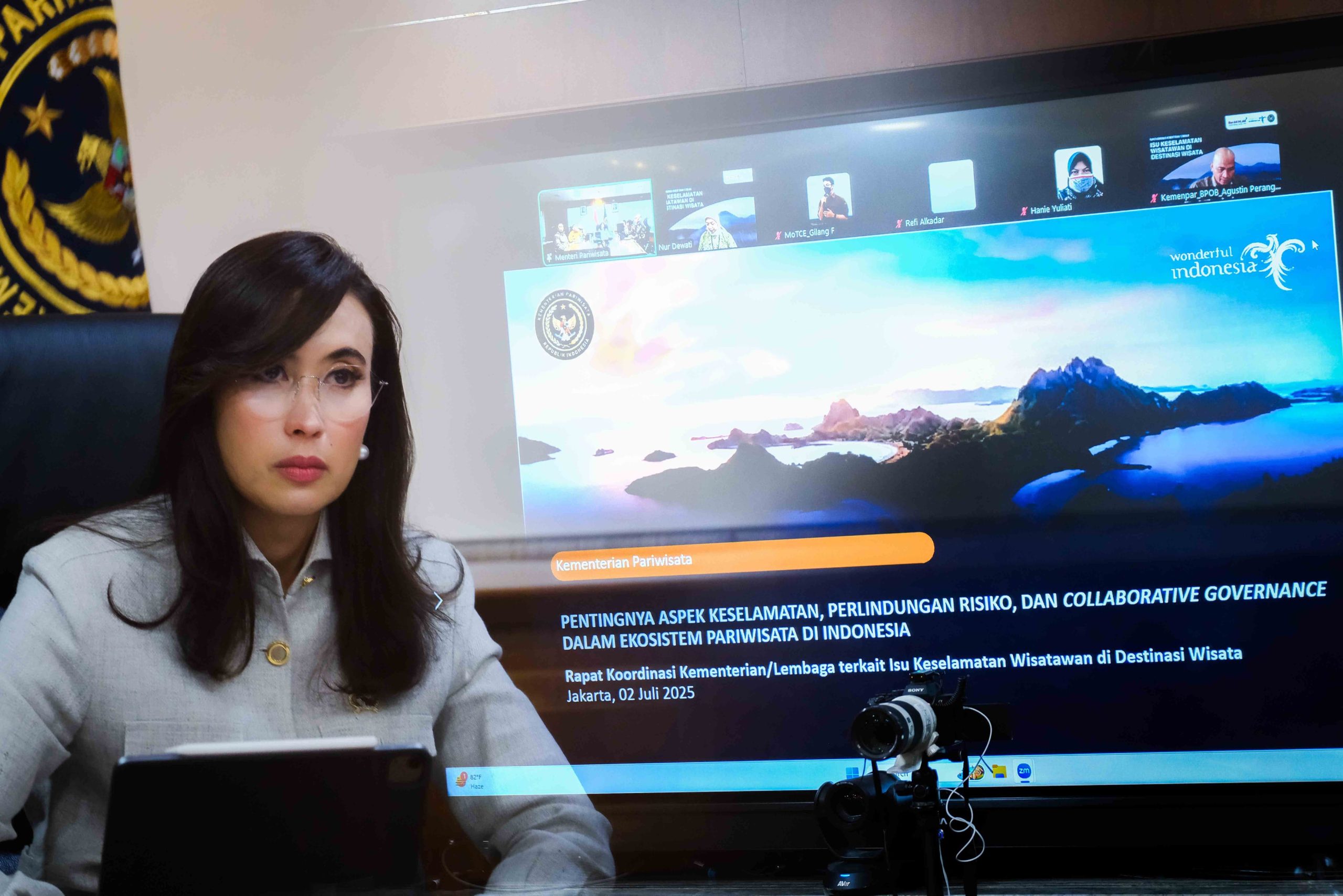 Menteri Pariwisata saat membuka kegiatan “Rapat Koordinasi K/L Terkait Isu Keselamatan Wisatawan di Destinasi Wisata” secara daring, Rabu (2/7) mengatakan, keselamatan wisatawan adalah isu lintas sektor yang membutuhkan perhatian dan aksi bersama. “Tanpa sistem keselamatan yang kuat, pariwisata tidak akan berkelanjutan apalagi mampu bersaing secara global,” ujar Menteri Pariwisata.