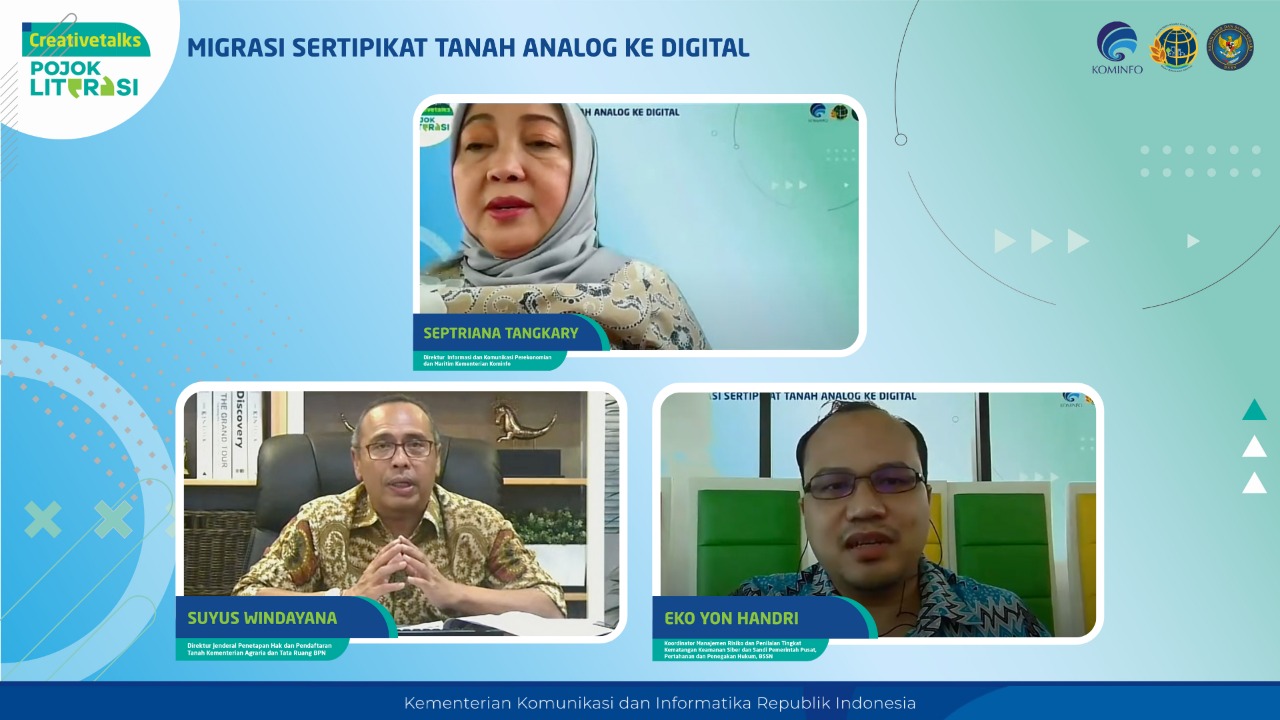 Demikian disampaikan Direktur Informasi dan Komunikasi Perekonomian dan Maritim Kementerian Kominfo, Septriana Tangkary yang mewakili Direktur Jenderal Informasi dan Komunikasi Publik Kementerian Kominfo, Usman Kansong, dalam sambutannya membuka acara webinar Creative Talks Pojok Literasi “Migrasi Sertifikat Tanah dari Analog ke Digital” di Jakarta, Jumat (5/11).
