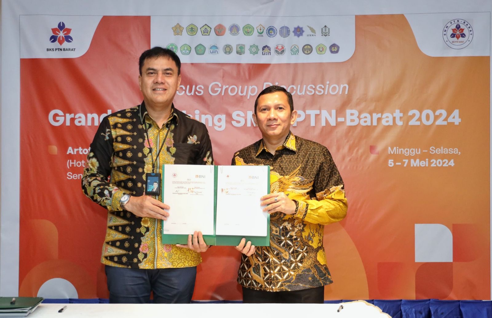 Komitmen BNI untuk memperkuat pendidikan tinggi diwujudkan melalui Penandatangan Perjanjian Kerja Sama dengan Panitia SMMPTN Barat 2024, termasuk mengenai pembayaran pendaftaran SMMPTN-Barat 2024 di Hotel Atlet Century Park, Jakarta, Senin (6/5).